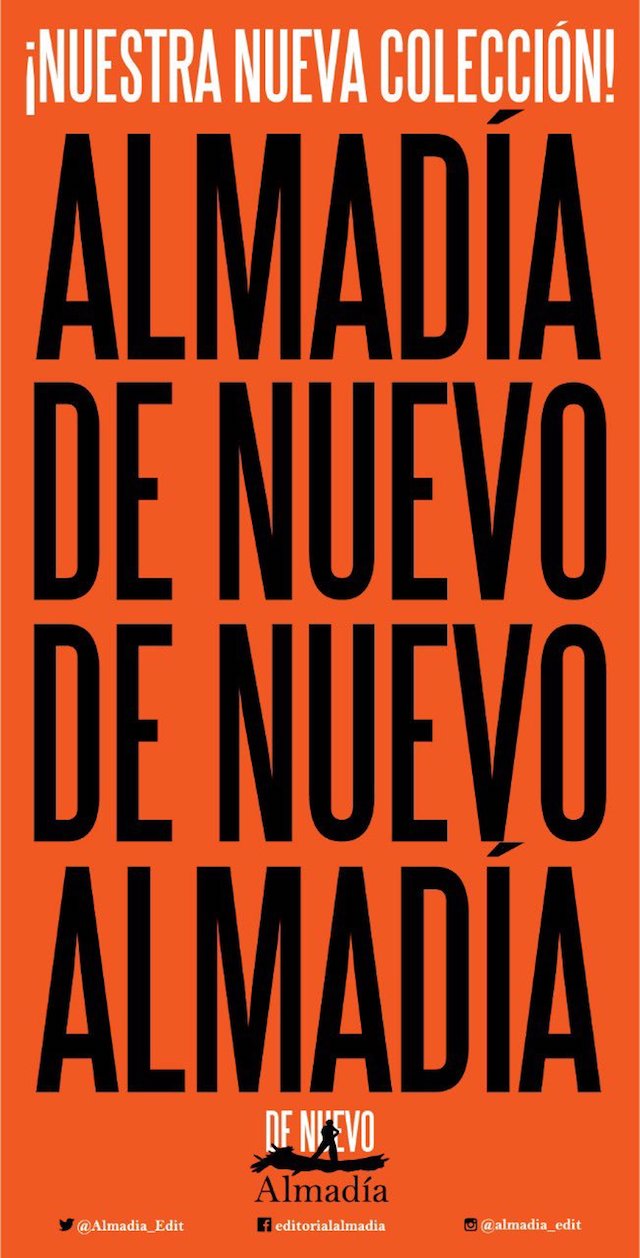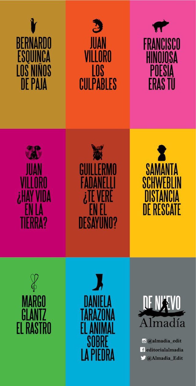 Con el #Hashtag y el slogan “De Nuevo Almadía”, la editorial lanza libros como El animal sobre la piedra, de Daniela Tarazona; El rastro, de Margo Glantz; Llamadas de Ámsterdam, Los culpables y ¿Hay vida en la Tierra?, de Juan Villoro; Distancia de rescate, de Samanta Schweblin; Poesía eras tú, de Francisco Hinojosa; ¿Te veré en el desayuno?, de Guillermo Fadanelli; Los hijos de paja, de Bernardo Esquinca.