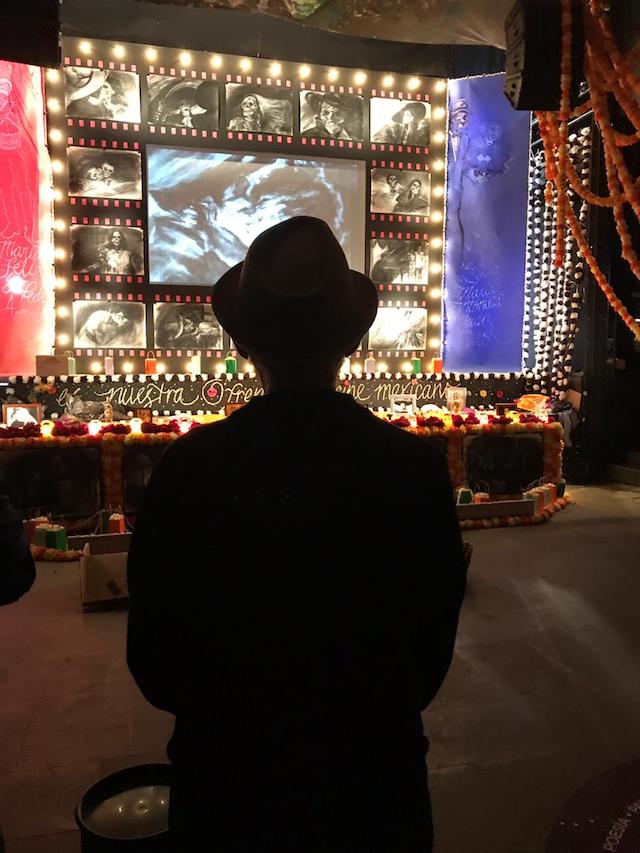 Ciudad de México, 30 de octubre (MaremotoM).- Una calavera sobre la pantalla de cine. Una calavera colorida sobre un manto negro. Algo dice fiesta por todos los rincones. La muerte es parte de la vida. Vivir en México hace que uno entienda y hable de vez en cuando con la muerte. En estos años, cuando “ya tenemos una edad” –como dice Santiago Auserón- debemos cada día toparnos con alguien que se va, con alguien querido que ya no veremos nunca. Así lo dice el artista puertorriqueño Antonio Martorell (San Juan, 1939), quien ha montado el Altar de Muertos de la Universidad del Claustro de Sor Juana, bajo el título Ofrenda puertorriqueña al cine mexicano en blanco y negro: de Santa a Roma, un recorrido por las mejores películas donde el beso es el hilo conductor.