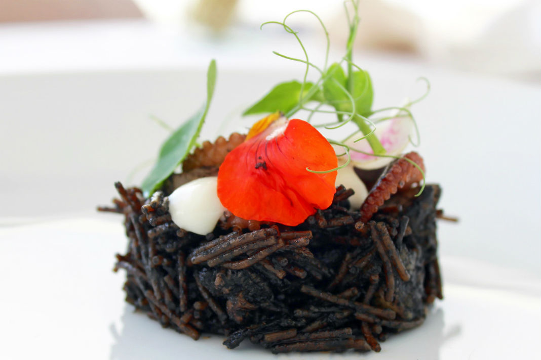 Fideo frito en tinta de calamar, camarón, pulpo baby y alioli de ajo