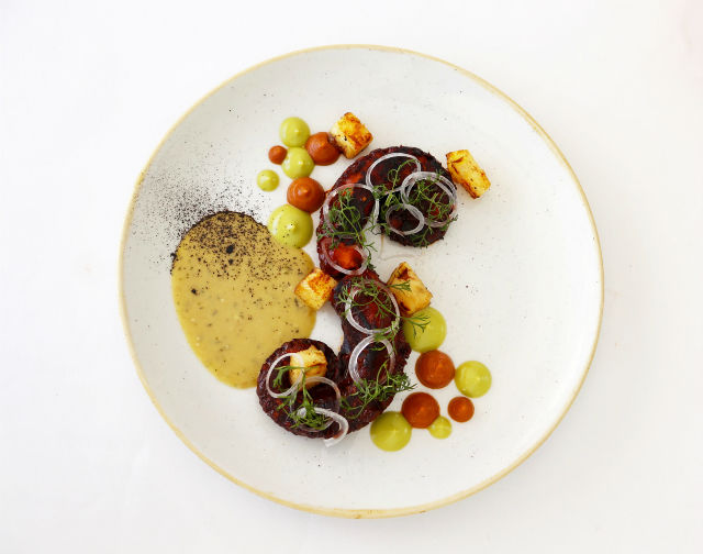 Pulpo, salsa ceniza taquera, piña asada, puré de piña con chile guajillo y mayonesa de cilantro