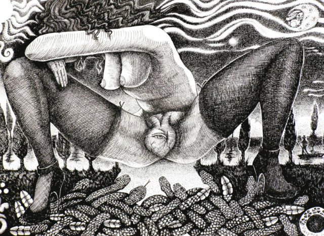 Gerardo Rivera Kura (Ciudad de México, 1967) exhibe la serie de dibujos Necronomicómix que tiene como ejes el erotismo y la muerte (eros y tánatos), con referencias simbólicas que aluden al esoterismo, la religión y la cultura prehispánica.