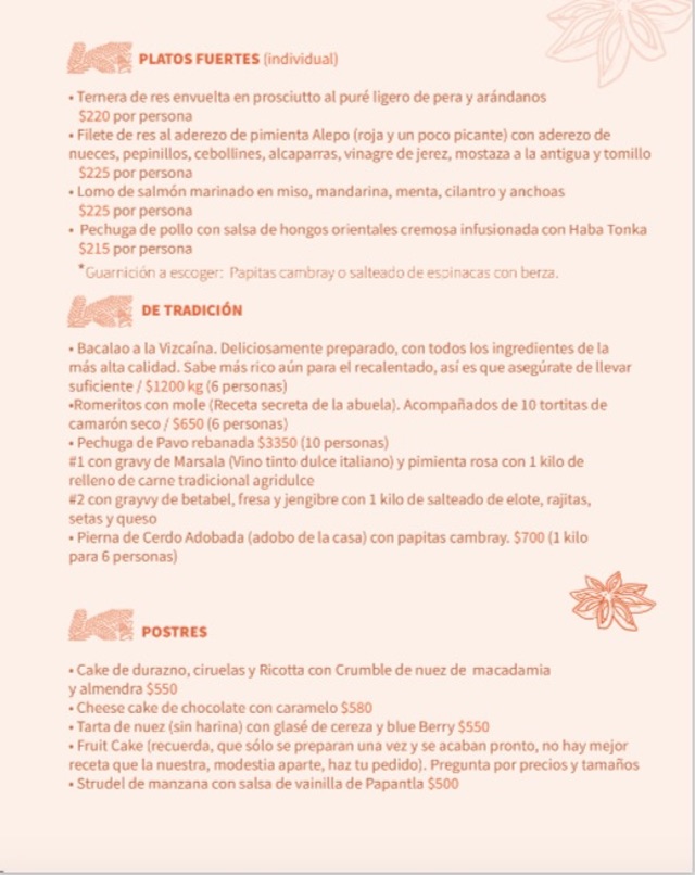 Marión Díaz, nuestra chef favorita, la dueña de Bistrot M, que tiene una gran cena de fin de año para llevártela con un alcance de teléfono. Claro, hay algunas recomendaciones como elaborar tu pedido una semana antes y sabiendo que hay Servicio a Domicilio, por una compra de 250 pesos a 350, dependiendo la zona de la entrega.