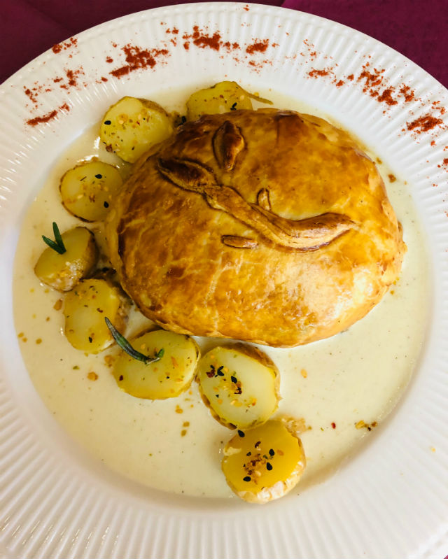 Filete de Res Wellington con cebolla caramelizada, mantequilla de romero en salsa de gorgonzola