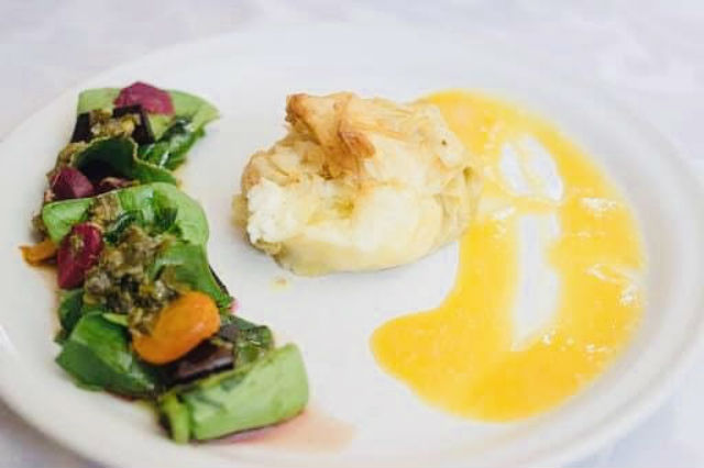 Saquito de Pasta filo relleno de queso de cabra y de oveja en salsa de naranja con miel y romero
