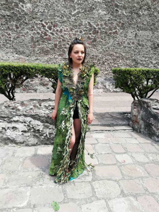 El vestido titulado La bruja vieja está confeccionado con varias capas de hoja santa, previamente disecadas. Al frente, a nivel del torso, lleva aplicaciones de diversas plantas medicinales y comestibles, como tomillo, hierbabuena, manzanilla, epazote, toronjil, albahaca, laurel y orégano, que van entrelazadas y cosidas. A nivel de la cintura hacia abajo, cuelgan aplicaciones de hoja de laurel.