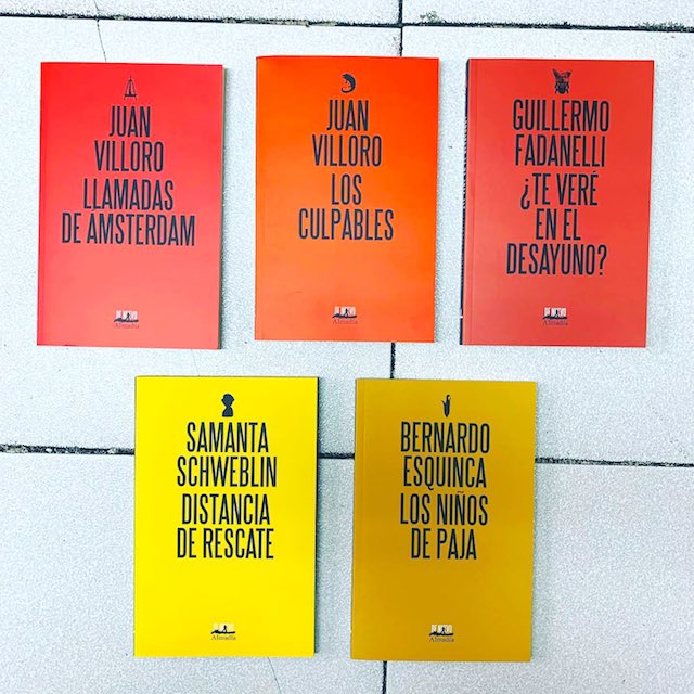 “Algunos elementos del diseño de la nueva colección #AlmadíadeNuevo Portadas, lomos, contraportada, emblema. Además muy contento por haber escrito el texto de contraportada del emblemático libro Los culpables, de Juan Villoro”, dice Alejandro en su cuenta de Twitter.