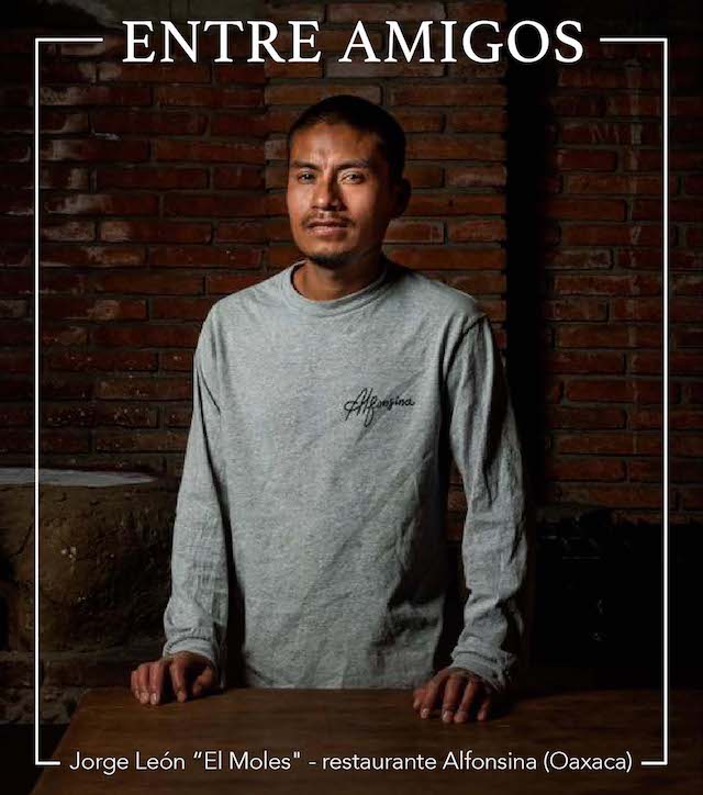 El chef Jorge León “El Moles”, de “Alfonsina” de Oaxaca, es originario de Santo Domingo Nundo Mixteca de Oaxaca. Trabajó en “Casa Oaxaca” durante tres años, después en “Pujol” por cinco años y apoyó en restaurantes como “Cosme”, “Manta” y “Molino el Pujol”. Hace nueve meses regresó a Oaxaca a trabajar en el proyecto “Alfonsina”, en el cual cocina junto con su madre, ubicado a 15 minutos de la ciudad. No hay menú establecido, pues se ofrece lo que se encuentra en el mercado.