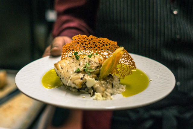 Lomo de salmón con risotto negro y salsa de naranja con maracuyá.