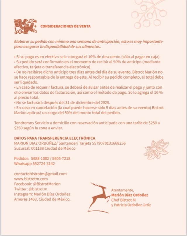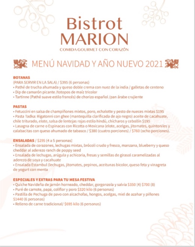 Marión Díaz, nuestra chef favorita, la dueña de Bistrot M, que tiene una gran cena de fin de año para llevártela con un alcance de teléfono. Claro, hay algunas recomendaciones como elaborar tu pedido una semana antes y sabiendo que hay Servicio a Domicilio, por una compra de 250 pesos a 350, dependiendo la zona de la entrega.