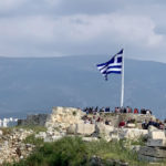 Al fondo de la meseta y dominando la ciudad, ondea orgullosa una gigante y blanquiazul bandera griega.