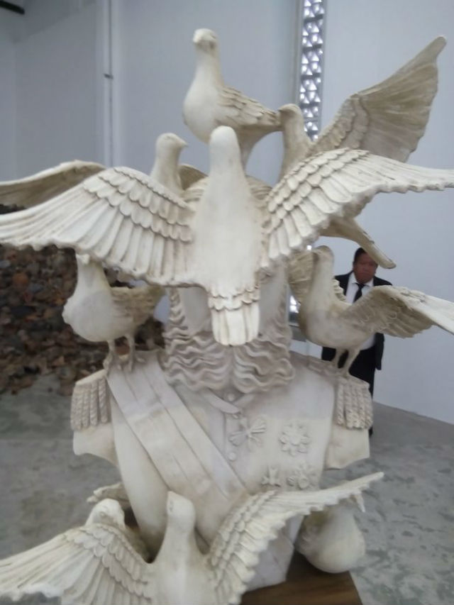 Ahí está una águila caída con el nombre de “El fracaso de la libertad”, de 2014. Esta ave patas p’arriba, de bronce, me recuerda —a propósito de que hace nos días vino el artista chino Ai Weiwei a México por la apertura de un exposición en el MUAC—, el jarrón de cerámica milenario de la dinastía Han, que soltó de sus manos mientras era fotografiado. Dice el artista chino al respecto que Mao decía que: “para construir una nueva civilización había que destruir la vieja”. Y eso fue lo que hizo “simbólicamente”Ai Weiwei.