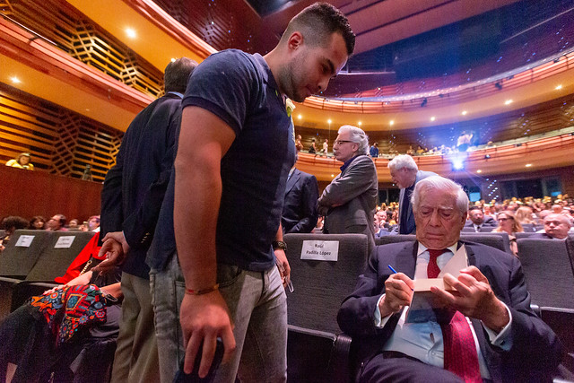 En el público, estaba Mario Vargas Llosa, escuchando todo lo que salía de la escena. Felipe Garrido, Carlos Franz, Alberto Ruy Sánchez, Alberto Chimal, David Toscana, Alonso Cueto, Mónica Lavín, en esa gran noche de la novela.